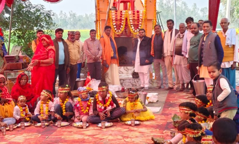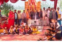उल्लासपूर्ण माहौल में श्री काली माता मंदिर माँजनपुर में शिखर पर कलश स्थापना