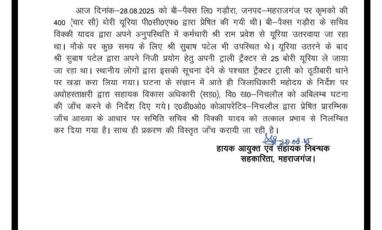 महराजगंज से बड़ी खबर बिना रोस्टर के यूरिया देने पर सचिव निलंबित