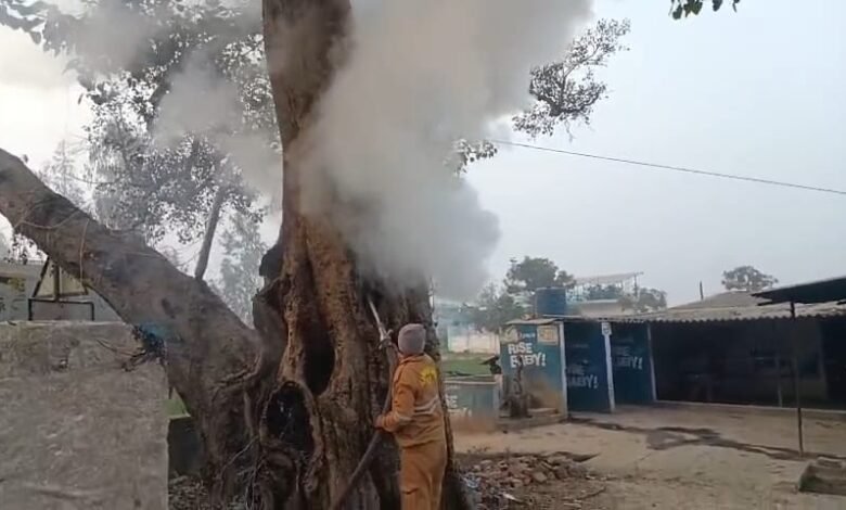 हाइवे के किनारे लगे पीपल के विशालकाय वृक्ष में लगी आग